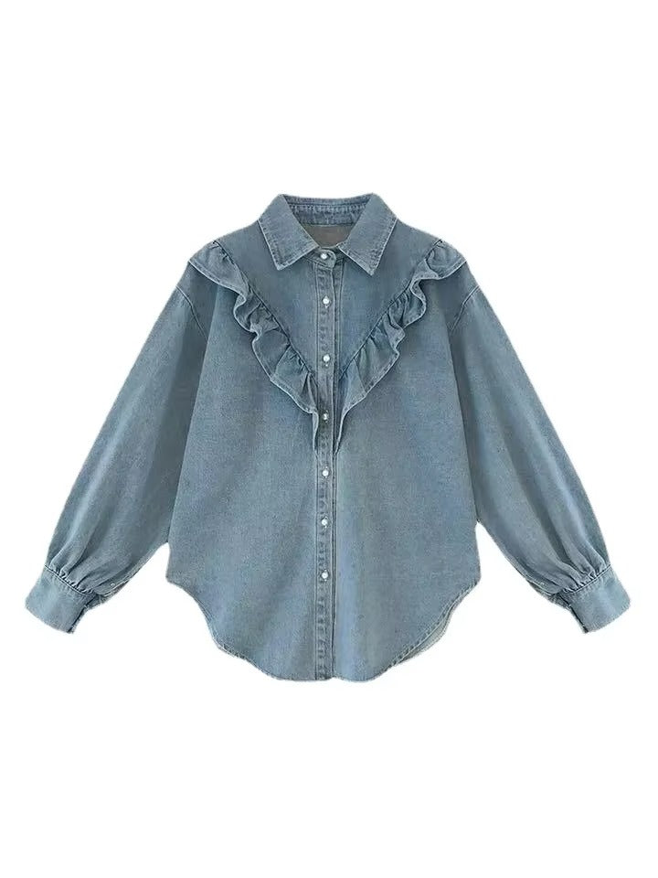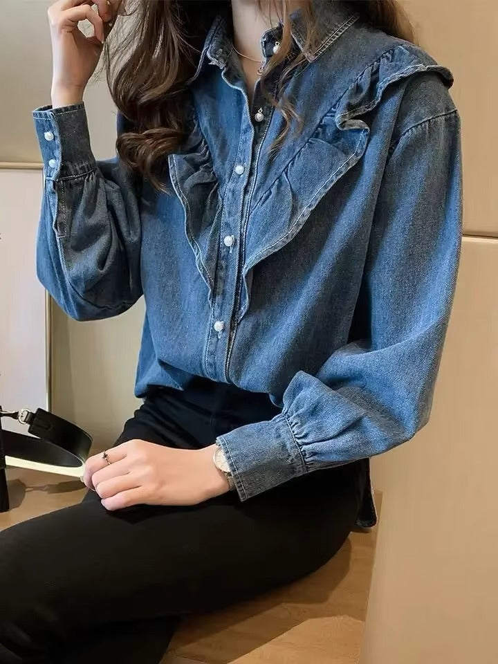 Isélia je košile, kterou si zamilujete na první oblečení – díky 100% přírodní bavlně je měkká, prodyšná a zároveň hřejivá. Jemné volánky na přední straně dodávají romantický nádech a džínová modrá barva se hodí ke všemu. Skvěle padne jak k džínům, tak ke klasickým kalhotám nebo sukni. Ideální volba pro chladnější dny, kdy chcete být stylová i v teple.